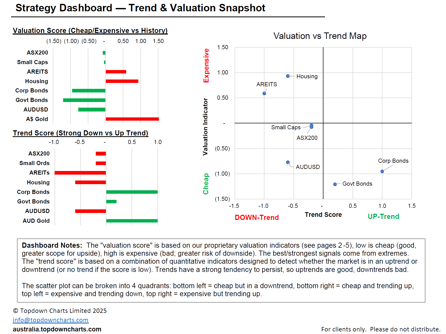 Along with the charts and indicators (+glossary explaining them), also included is a summary dashboard to help you get a quick sense of where things are sitting: