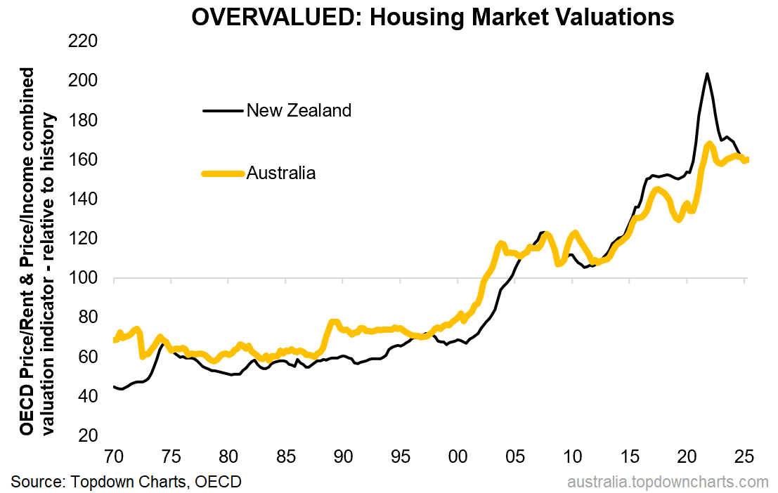 Australian and New Zealand share many things in common, but one key issue they both share + struggle with — and let’s be honest: also revel in, is evermore expensive housing markets. It’s a source and store of wealth for many but a hardship and sore point for others. And this week’s chart lays it out clear and bare.